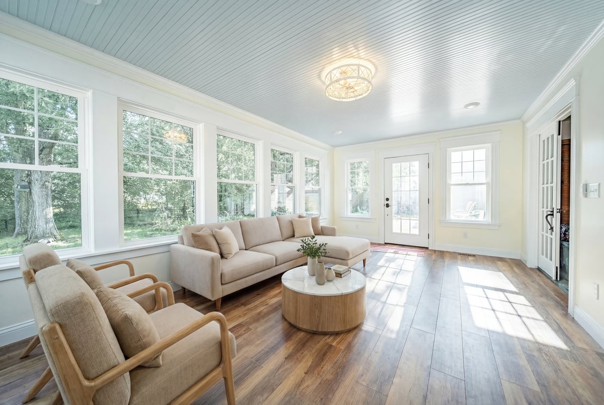 The new four-season sunroom addition was thoughtfully designed to meet the homeowners' needs for comfort and style. The space features tall double-hung windows with grid detailing on the upper panes, providing ample natural light and a perfect perch for houseplants. A beadboard ceiling, painted a soft blue, adds charm and visual interest, while durable luxury vinyl plank (LVP) flooring in a warm oak tone offers long-lasting beauty and practicality.
