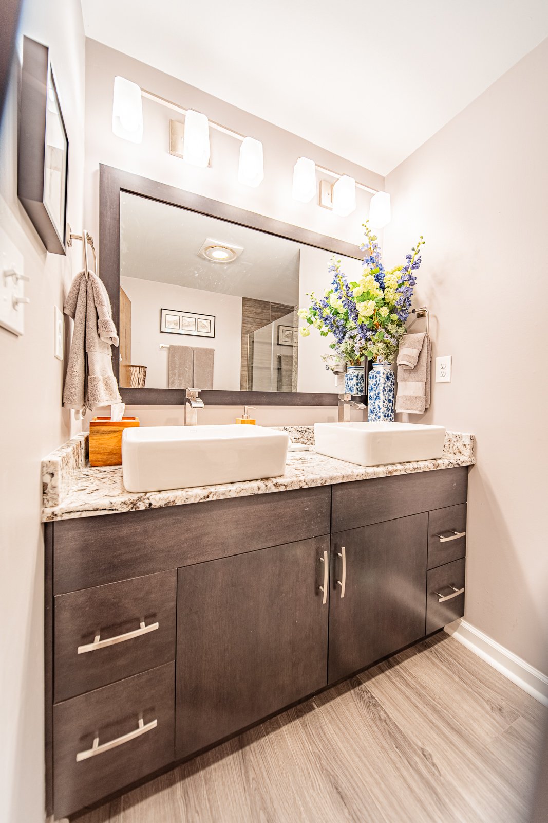 The renovations have transformed both bathrooms into modern, stylish spaces that not only enhance the functionality of the home but also reflect the homeowners' taste for contemporary design. The cohesive use of materials and finishes across both spaces ensures a unified look that ties the rooms together with the rest of the home.
